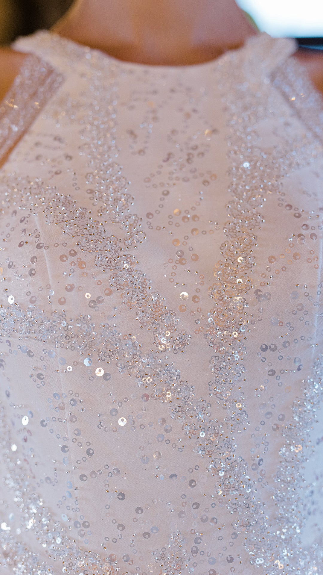 The Sirius A-line wedding dress is a stunning masterpiece that will make any bride feel like royalty. The closed neck and open back design perfectly merge elegance with a hint of seduction. The shiny lace and hanging crystal drops add a touch of glamour that catches the light beautifully. Crafted from Tulle and Glittery fabric, this dress is adorned with beads, sequins, and crystals that glitter with every move.